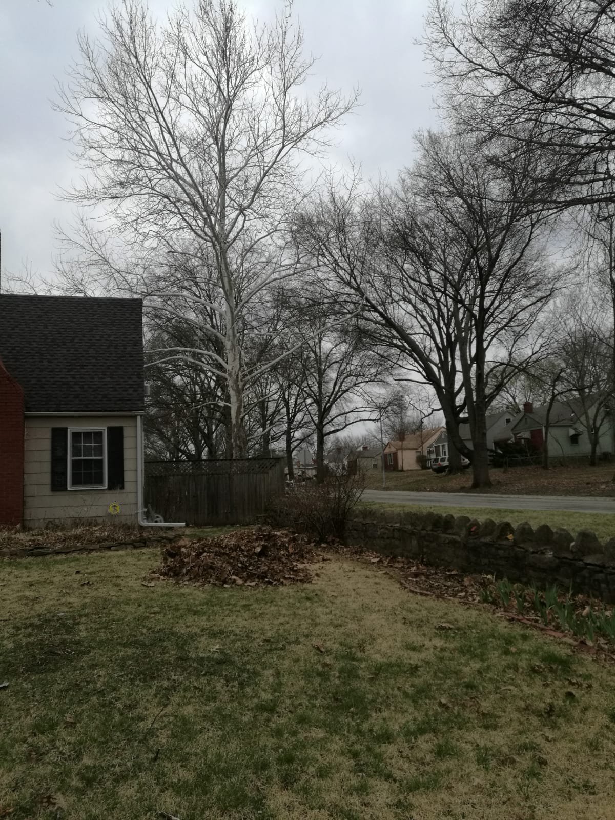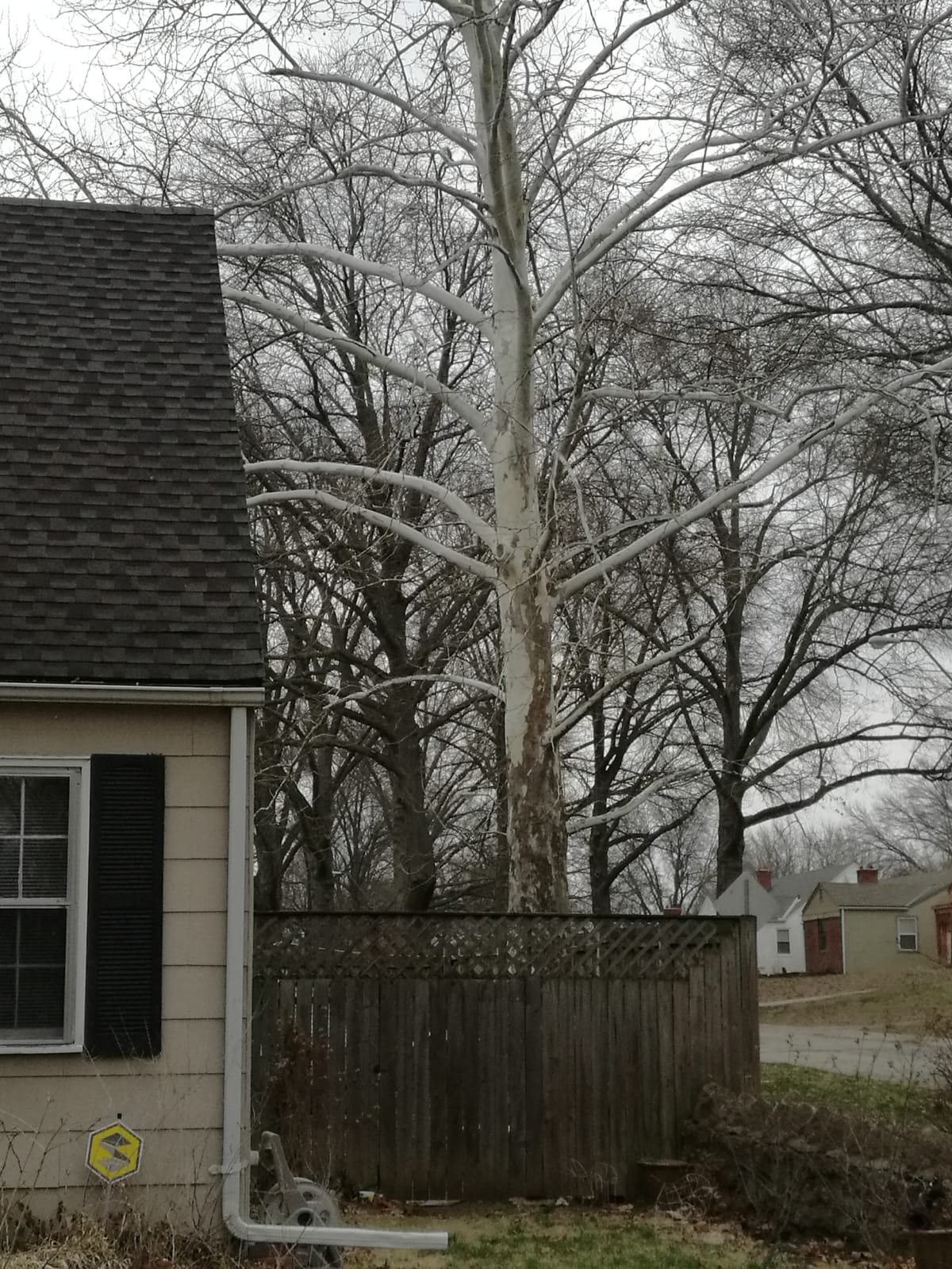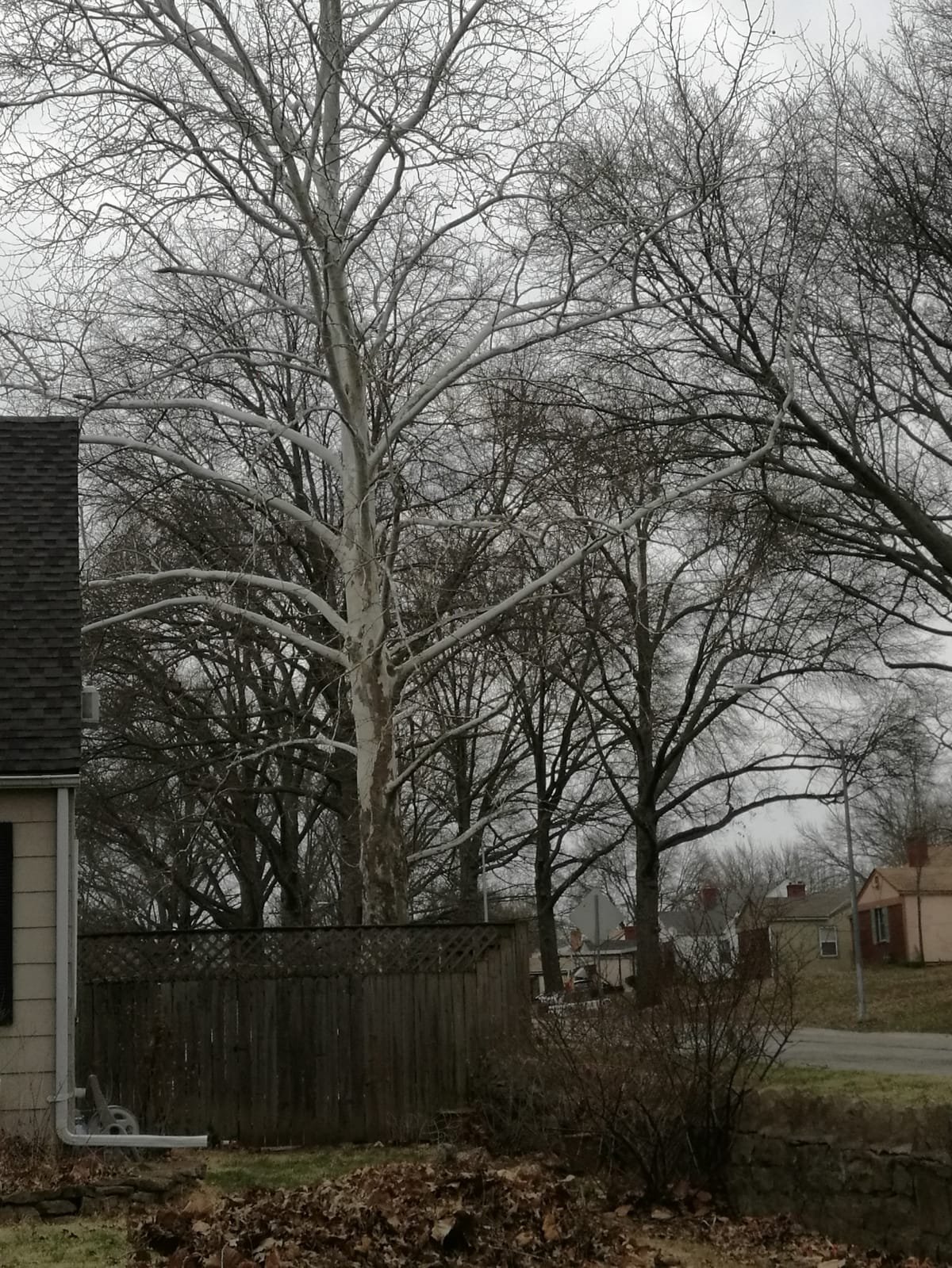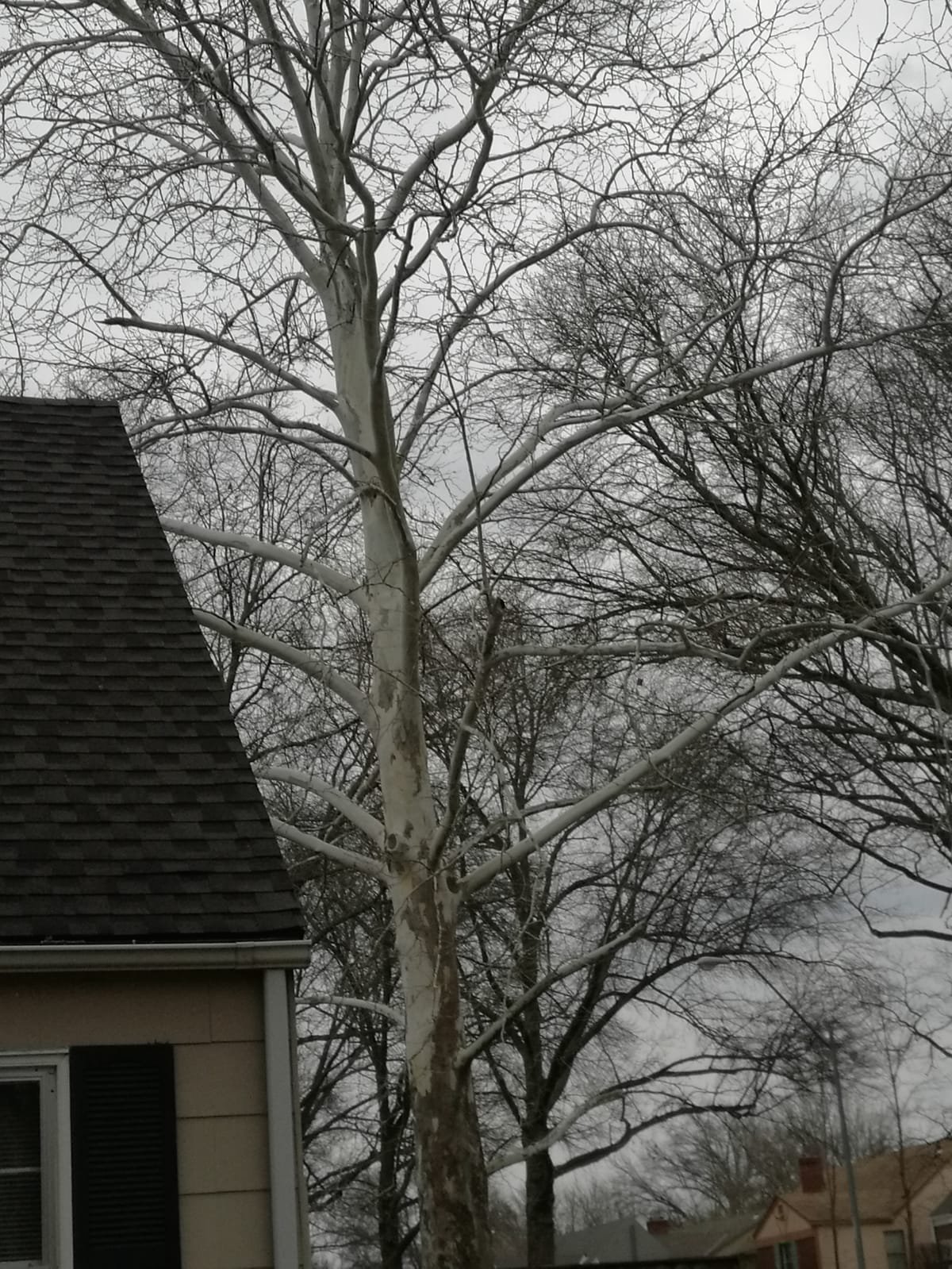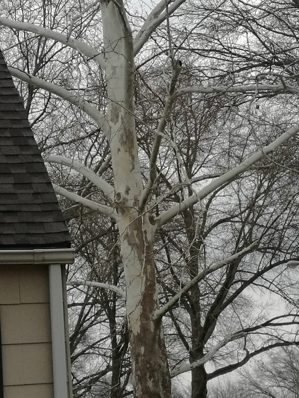 On the Southeast corner of my humble abode stands this enormous, really beautiful tree. Seen below on a cloudy recent morning. It is at it’s most striking right now I think. With it’s usual spotted brown bark stripped in the fall and now standing there stark bare waiting for spring to begin. You can spot it from miles away. Quite a sight to see really.